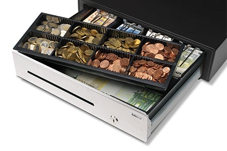 Modern cash drawers are made of a metal outer casing and a plastic inner tray (or “till”). The till is divided into several compartments for banknotes and coins and is often removable. The drawer’s durability and security depend on the quality of its materials and construction, so be sure to look for one with a thick-gauge steel exterior, shatterproof PVC tray, robust slider mechanism and sturdy lock. All Safescan cash drawers and trays meet these requirements.