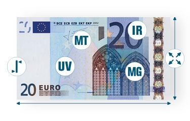 - Value counting and 6-point counterfeit detection for EUR banknotes: UV, magnetic ink, metallic thread, infrared, thickness and size detection