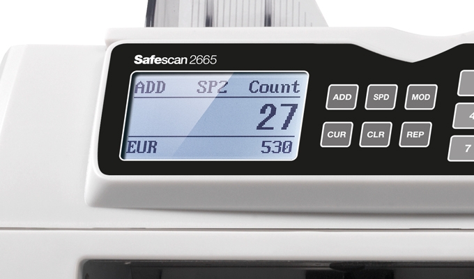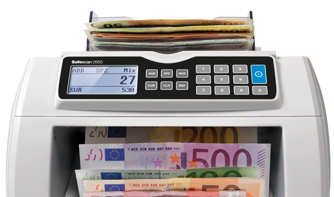 Like all Safescan money counters, the 2665 rapidly and reliably counts sorted bills in any currency, including custom coupons and vouchers. But it can also count unsorted notes in EUR. Just place your unsorted stack on the hopper and press start; the 2665 will automatically keep track of the number and value counted for each denomination.