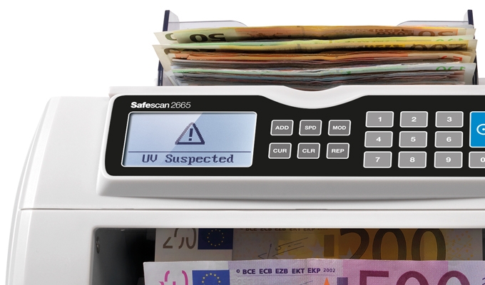 The 2665 is programmed to automatically identify and authenticate banknotes in 7 different currencies (EUR, GBP, USD, CHF, PLN, SEK and NOK). It checks all other currencies on up to three security features: UV ink, magnetic properties and size.