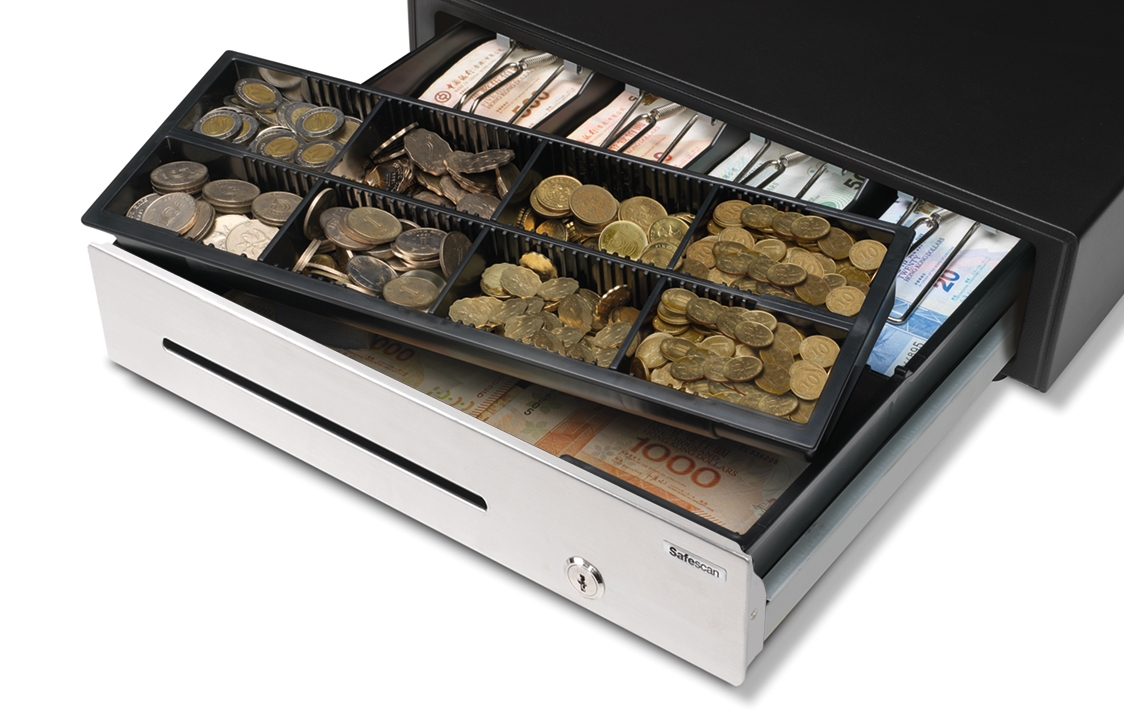 最简单的收款机是手动开关的,只需轻轻一推。比较先进的收款机也可以通过您的收据打印机控制:将抽屉连接POS 系统中,使用了行业标准的RJ12 接口,并把锁调至“在线”位置,收款机只会在当您触摸屏幕按钮或打印收据时打开。 (您也可以把锁调至“手动”位置,以手动将其打开。)将锁“锁定”位置,它便不会滑开。所有Safescan 收款机均提供电动和手动控制。