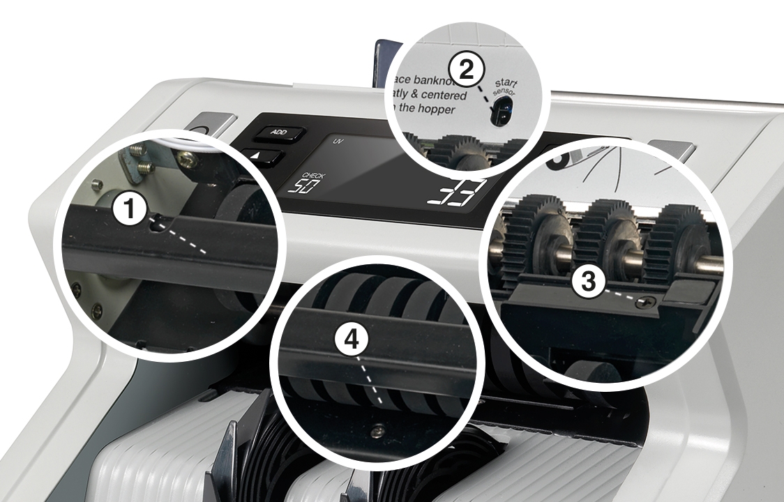 当钞票通过的装置时,一系列的内置传感器将检测在现时流通货币中的一个或更多的防伪特征。最简单的装置只检测紫外线标记的存在;比较高级的再设有磁性油墨和尺寸检测。最顶级的系列点钞机如Safescan 2600 系列被编程,以识别每种面额独特的属性,尺寸,紫外线,红外线,磁性油墨和全息图。 (如果您想了解更多有关验钞机如何运作,请参阅我们的验钞机页面。)