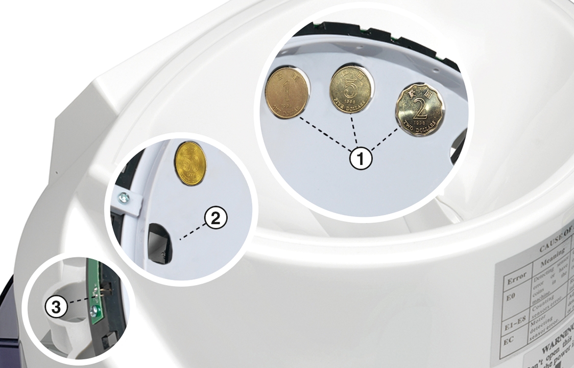 在任何的貨幣中,每個硬幣類型都有其獨特的直徑和厚度的 ➀。混合硬幣點算設備如Safescan 1250 採用自動化感應器和轉盤 ➁, ➂ 以準確地根據這些單獨硬幣的參數和篩選他們到不同的接收杯。
