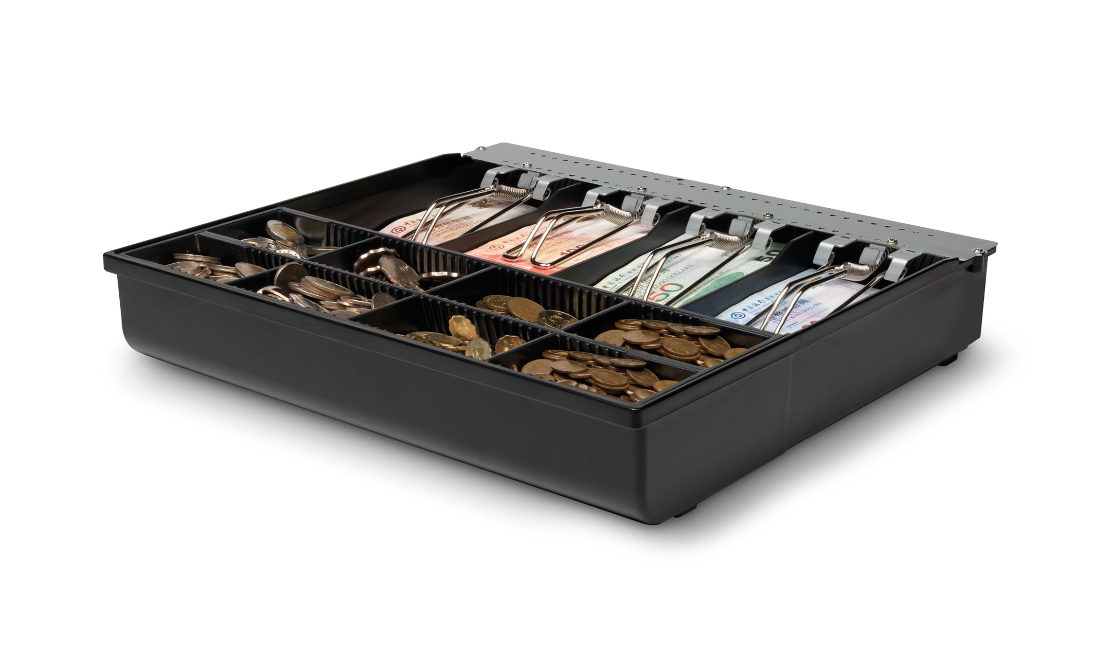 可調動紙幣格讓您可以自定義您的3540T 現金內格想如何存放的鈔票,另外八個可調動硬幣格將您的所有零錢及代幣整齊地存放在一個方便的地方。寬闊的分間槽提供充足的空間來保存待用券,信用卡收據和其他非現金交易項目。