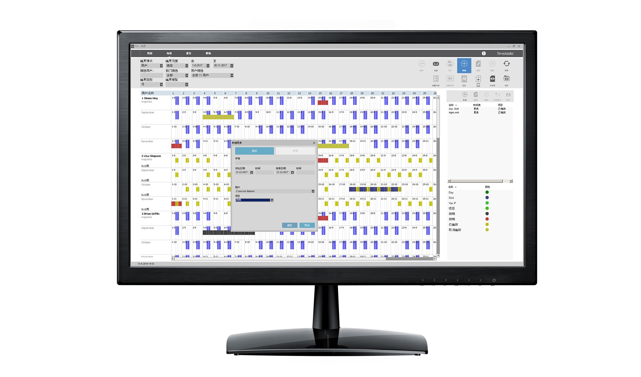 通過指定不同的顏色給予項目,成本中心和員工,可提高視覺的清晰度。利用它們並配合電腦+ 簡單易用的Drag & Drop(拖、放)編更技巧,輕鬆地規劃工作班次及即時將所編排時數與實際工作時數比較。