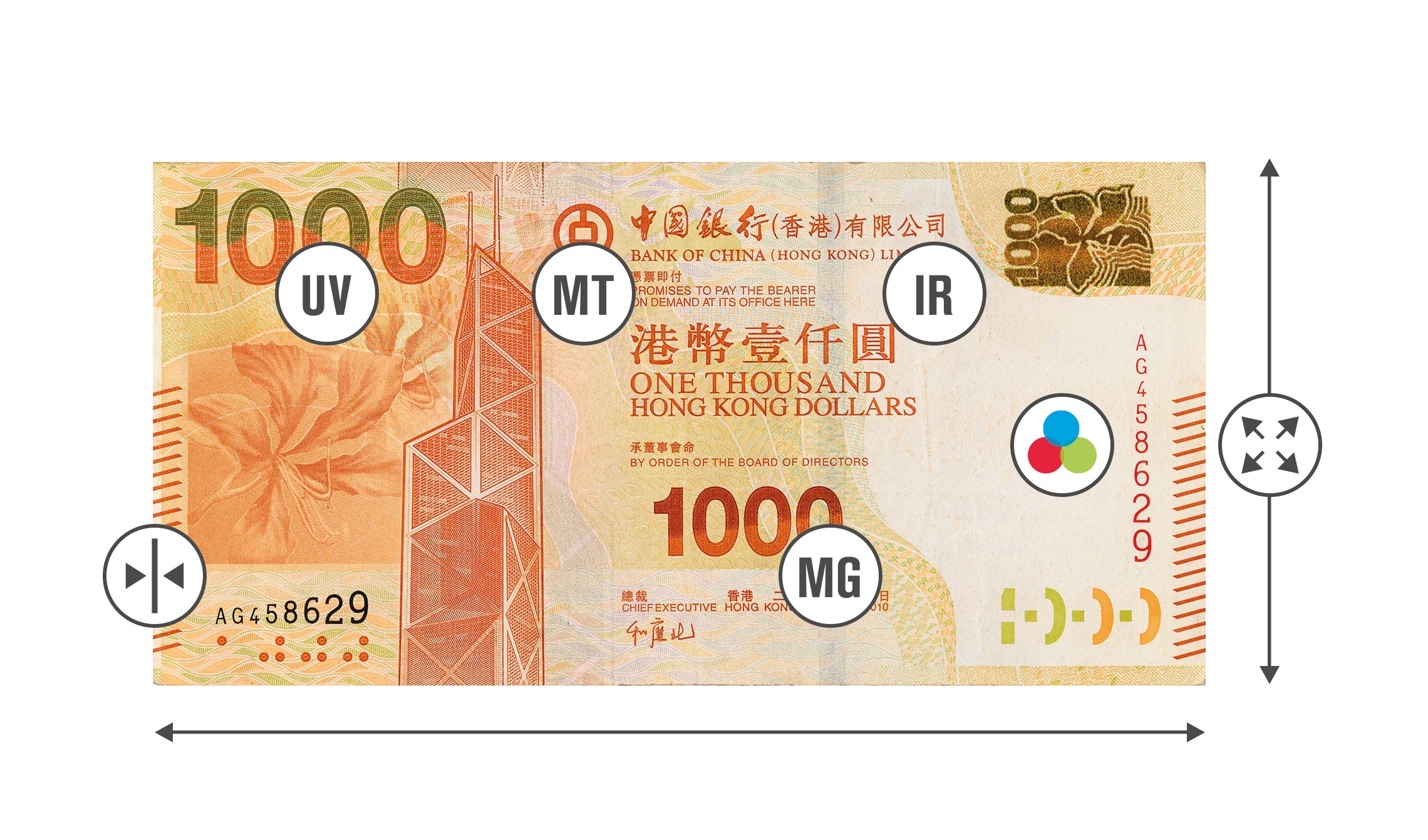 - 七種鑑偽功能︰紅外線,磁性油墨,金屬線,浮水印,顏色, 寬、闊度檢測以及尺寸檢測